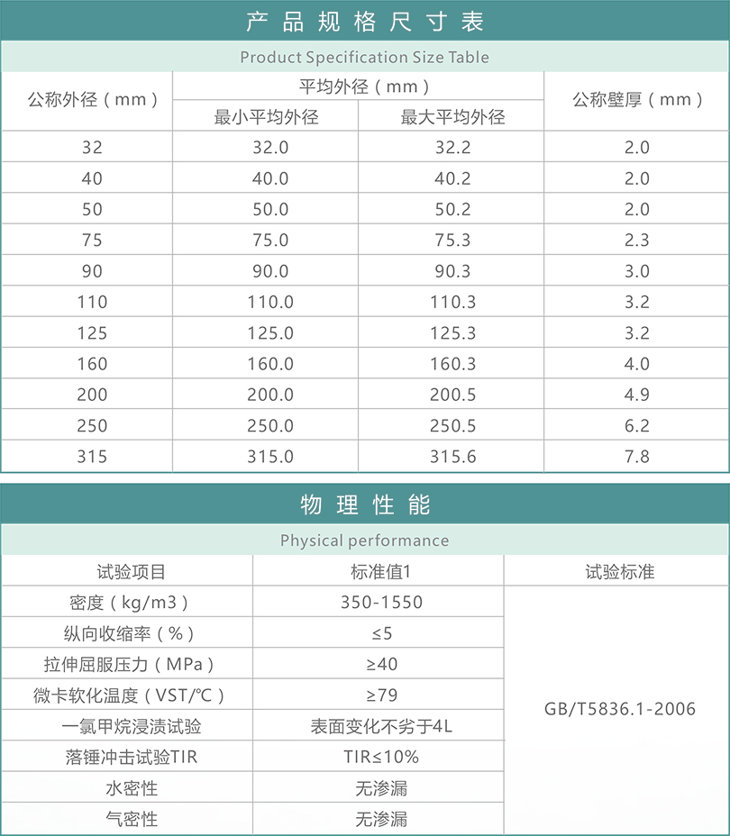 產(chǎn)品執(zhí)行標(biāo)準(zhǔn):GB/T5836.1-2006建筑排水用硬聚氯乙烯(PVC-U) 第 一 部 分 : 管 材G B / T 5 8 3 6 . 2 -2006建筑排水用硬聚氯乙烯(PVC-U)第一部分:管件